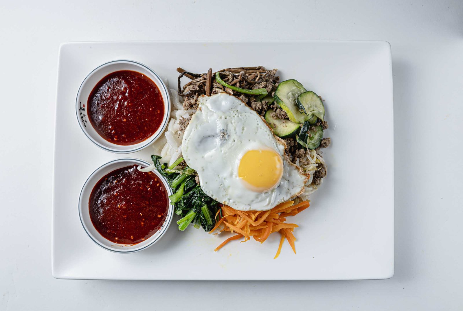Beef Bi Bim Bap is a vibrant and nourishing Korean rice bowl packed with flavor and texture. This signature dish features thinly sliced, marinated beef that’s grilled to tender perfection, laid over a warm bed of steamed rice. It’s topped with a colorful array of sautéed vegetables—like spinach, carrots, bean sprouts, and zucchini—and finished with a perfectly fried egg. A drizzle of spicy gochujang sauce ties it all together, making every bite a delicious balance of savory, spicy, and umami. Mix it all up and enjoy a comforting and satisfying meal in one bowl.