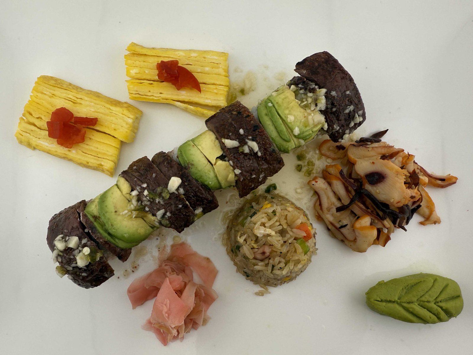 A Fusion Roll Incorporating Local Texan and Mexican Flavors. Features Baked Salmon, Cream Cheese and Cucumber, Topped with Baked Hanger Steak and Avocado