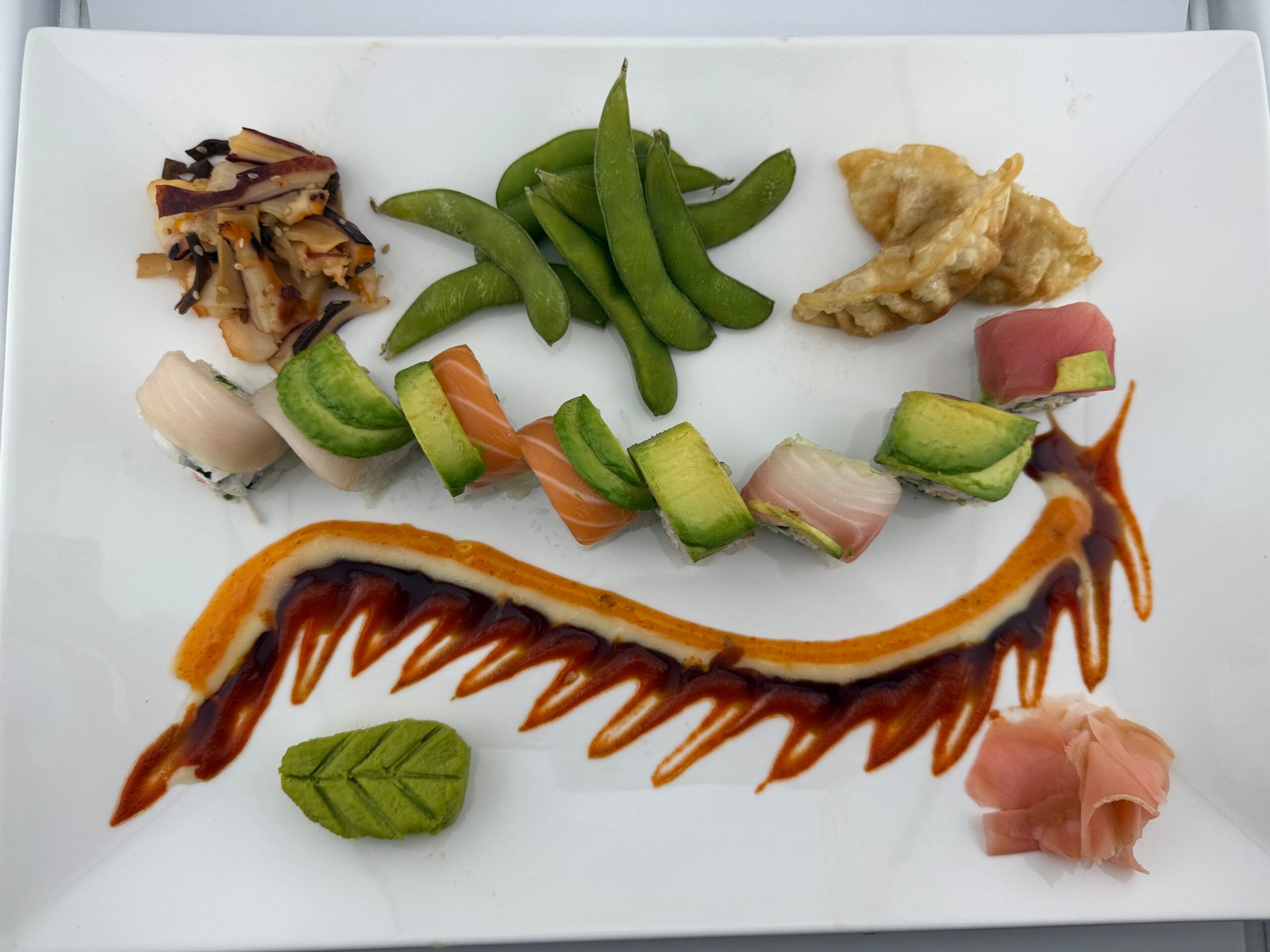 A Colorful assortment Featuring Avocado, Crab Meat and Cucumber, Topped with Avocado and Various Slices of Fresh Fish Including Tuna and Salmon.