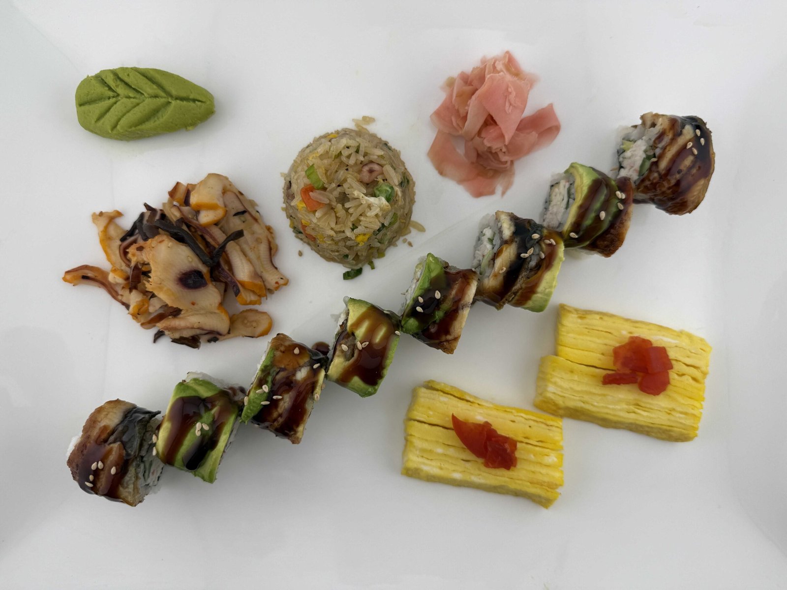 Avocado, Crab Meat and Cucumber, Topped with Eel, Avocado, and Yumi Eel Sauce.