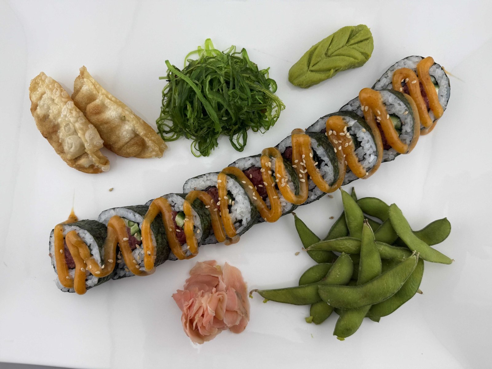 The Spicy Tuna Roll is a bold and vibrant sushi roll that packs a punch. Inside, you’ll find fresh tuna mixed with spicy mayo, giving it a fiery kick, complemented by creamy avocado and crisp cucumber for balance. The roll is typically topped with a drizzle of eel sauce and more spicy mayo, enhancing the flavors with a sweet, tangy, and spicy finish. It’s a perfect choice for those who love their sushi with a little heat and plenty of flavor.
